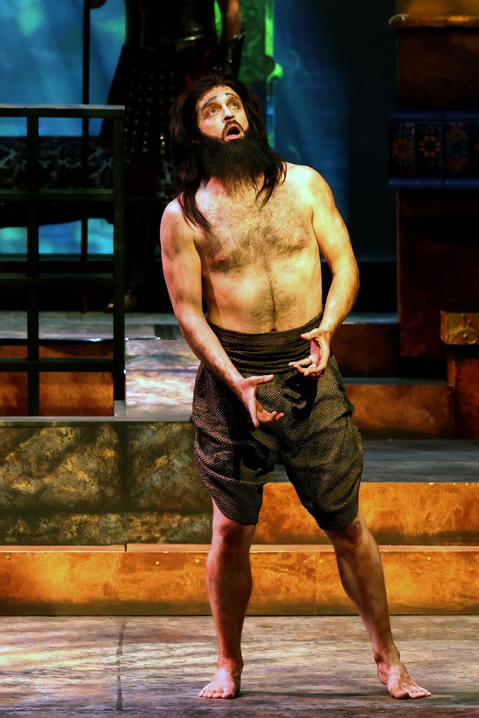 Another potential staging issue concerns the offstage singing of Iokanaan, as any singing behind the scenes can get lost. To begin with, Nathaniel Sullivan as Iokanaan has a strong and agile voice and when bedecked for it, fits the part well (i.e., in real-life he appears more a Clark Kent, but he transforms into primitive-looking Superman type). The solution is rather than singing from the wings, he sings from the cistern in the middle of the stage in which he is imprisoned. He also uses a homemade, unamplified megaphone, so that he comes through loud and clear.