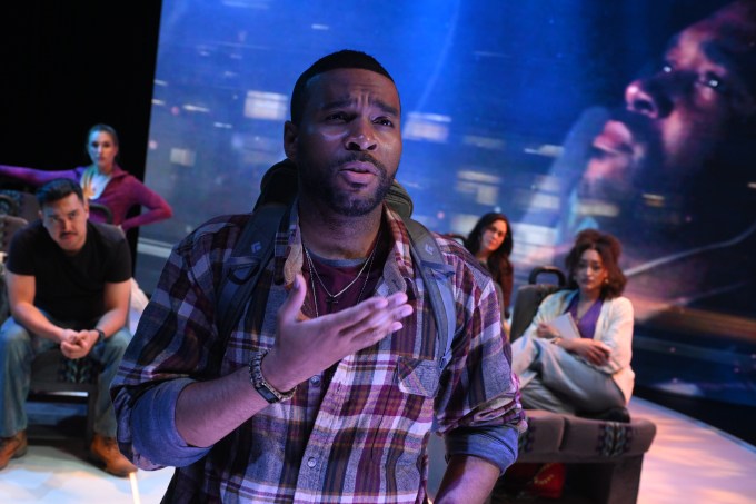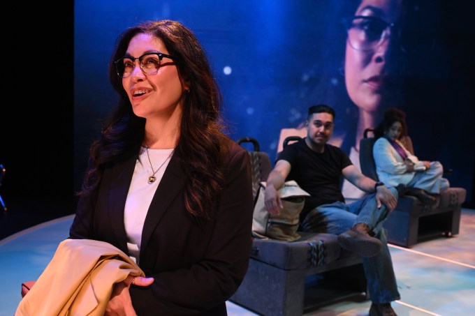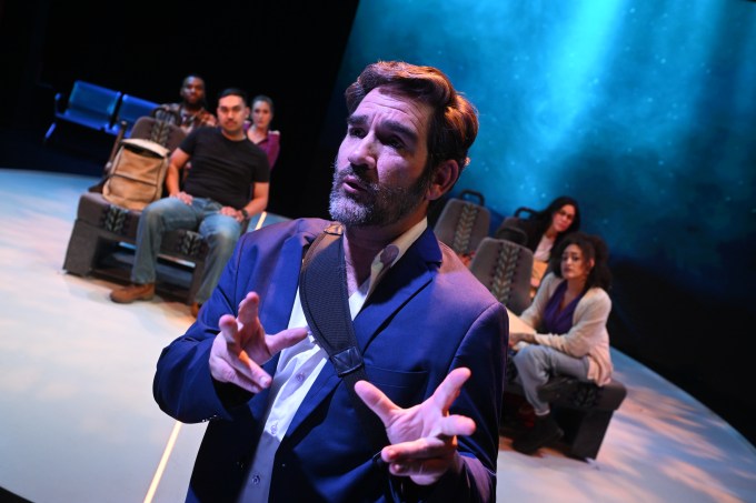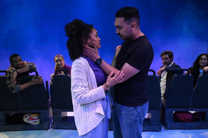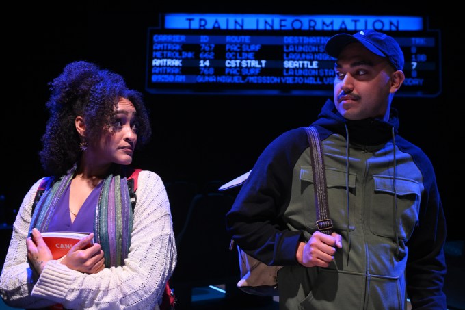 If the above seems to expose a lot of plot line, wait, there’s much more, and it’s highly enticing. In any case, the interactions are lively, and sometimes blistering, with poignant portraits of decent people fighting through lonely interludes yet not reaching out except in their imaginations. Though the events could play in a claustrophobic setting, two devices open up the staging. End-to-end projections (Erik Scanlon) on the back wall depict the California terrain as the train passes by. Also, pairs of passenger seats are joined and on rollers, so they can be scooted around, which they often are, and at times playfully or joyously.