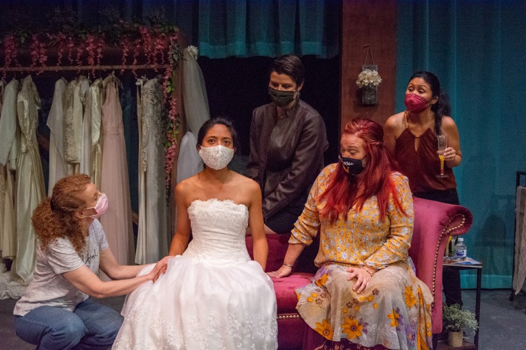 The other aspect of masking the cast is that it is realistic. “Mothers of the Bride” is not a historic play from Shakespeare or Tennessee Williams or whomever else. It is a world premiere, debuting in the here and now during the pandemic. Thus, it is a true time capsule. If several women were meeting at a bridal shop in today’s real life, they would be masked. Thus, the realism is compelling.
