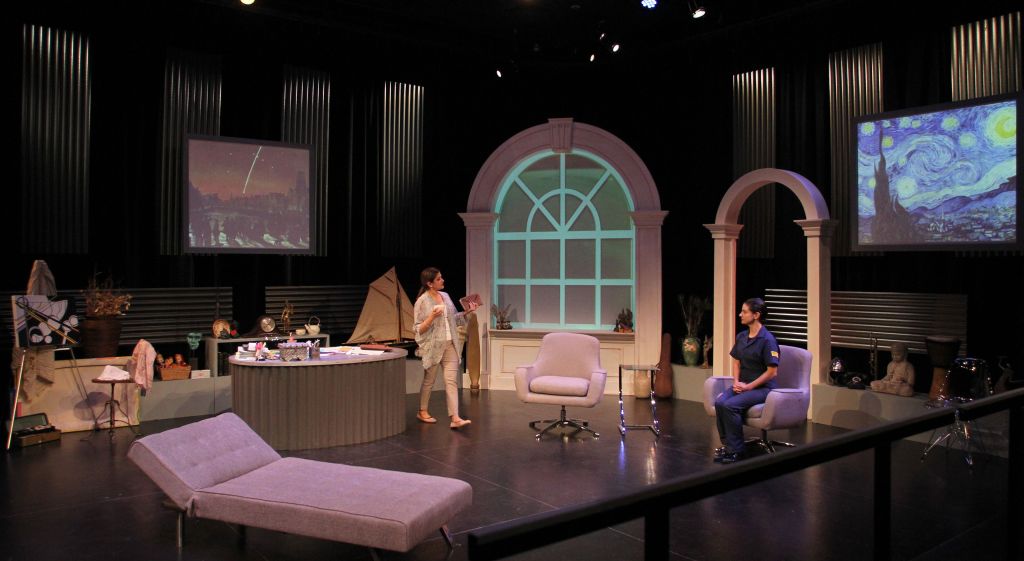 The show lacks a story arc. Whatever narrative glue is largely provided by the women writing letters to an advice columnist at “Shout” magazine, with spoken replies coming from the unseen columnist. The characters lack names but are identified by a particular color, which is dominant in the various outfits that each wears and relates to their behaviors. Orange, performed by Christina Bolognini, is domestic; Red, played by Melissa Momboisse, is a mess of youthful contradiction; Blue, portrayed by Heather Mae Steffen, is poised and beautiful – and she knows it; Green, rendered by Amanda Le Nguyen, is slutty; and Yellow, characterized by Jamie Gussman, is loud – and therefore, probably American!