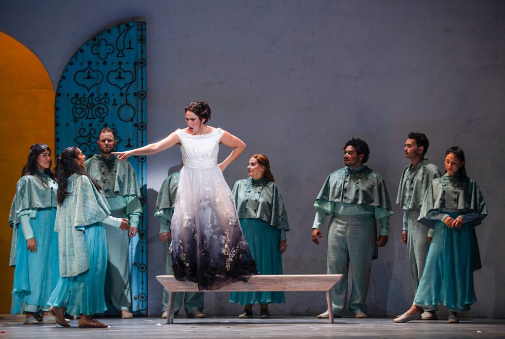 Ladies and Gentlemen – please welcome Opera San José back to the stage of their lovely home, the California Theatre. After 20 months of pandemic-induced darkness, OSJ has returned with a carefully-selected, one-hour opera, “Dido and Aeneas.” Although it was chosen nine moths ago, when live performance strictures were stricter, two characteristics still make it ideal. First, it is brief, which means the audience remains stationary indoors for a short period. Second, and uniquely, the entire orchestra is masked, as the composer’s orchestration calls for no wind instruments. OSJ’s configuration includes about two dozen strings, including a harpsichord, and one percussionist. Clever thinking by the decision makers. And to make it better, the company provides an outstanding rendering of the opera.