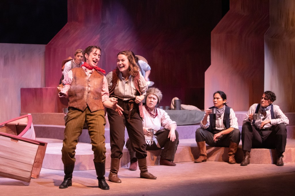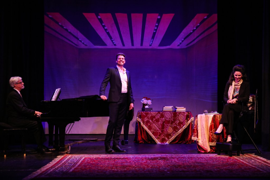 Three young singers appear before the diva. Each possesses a strong voice and the acting ability to play off Oberlin’s indominable insistence as Callas. Emily Owens Evans plays Sophie, the diffident ingenue, a sweet-voiced lyric soprano, who sings Amina’s lovely aria and cabaletta from Bellini’s “La Sonnambula.” The always smiling, confident, and somewhat bumptious tenor Rob Kaywin-Dornaus sings Puccini’s beautiful “Recondita Armonia” from“Tosca.” Of course, his presence prompts Callas’s tenor jokes. Finally, Morgan Harrington portrays Sharon, a dramatic soprano who, after the typical needling from Callas, nails Lady Macbeth’s aria from Verdi’s “Macbeth.” The arias are a benefaction to the ear and much of Callas’s criticism is highly instructive.