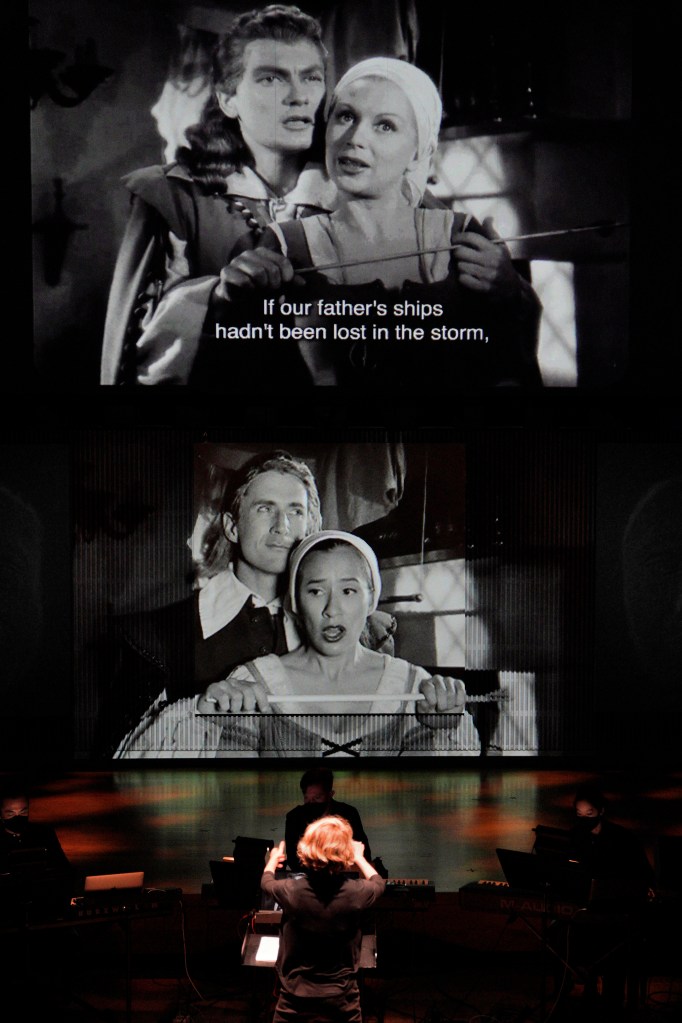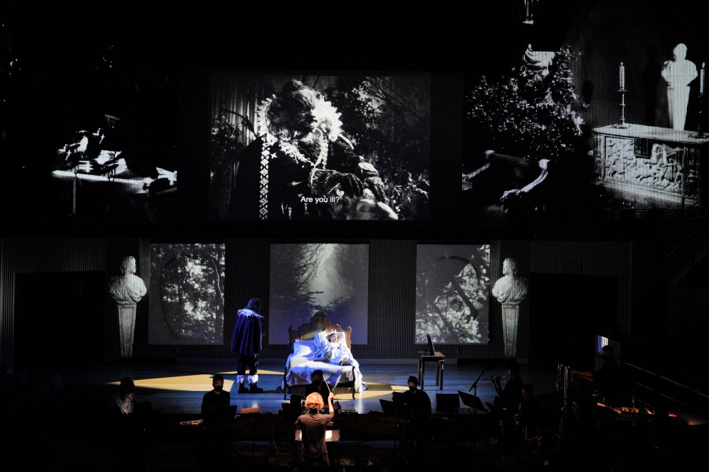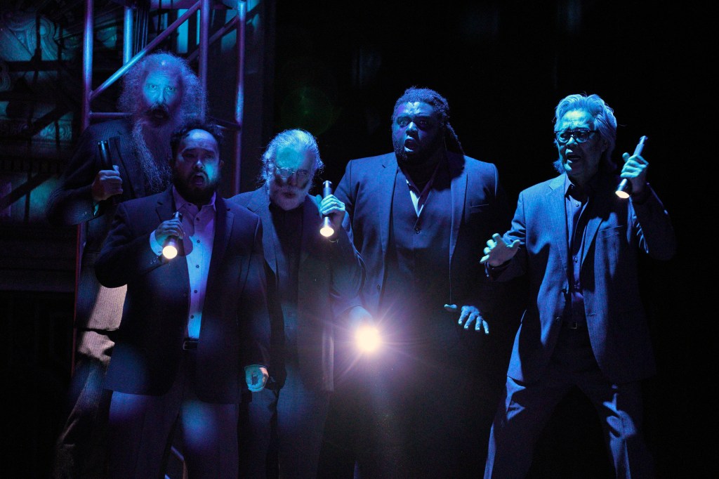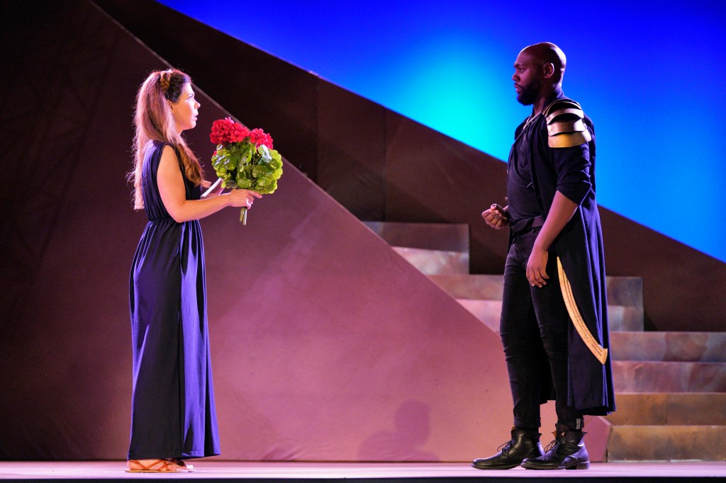 “Ariane & Bluebeard” possesses a compact narrative and melodious music that are lifted by outstanding voices. Expansive blocking, which uses all of the stage and more, includes a chase scene on foot that extends into the lower gallery of the house. One clumsy aspect of the production is the use of the same core staircase as in “Julius Caesar” but with different decorative framing. While it offers a smooth egress in the other opera, players in this one unceremoniously stagger up and down the structure, even stumbling. A clever aspect of the staircase is that it disassembles into pieces that characters lounge upon.