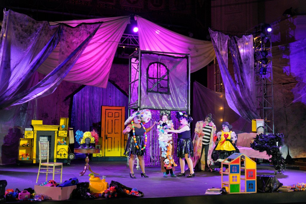 The opera is enhanced considerably by the visual elements in the production coordinated by Director Tara Branham. Jefferson Ridenour’s set mixes prosaic packing boxes with large hanging sheets of plastic and eye-catching props such as colorful teddy bears. A door that can spin on wheels is used to facilitate looking into the real versus alternate house spaces, but sometimes it is not immediately clear which side the players are in.