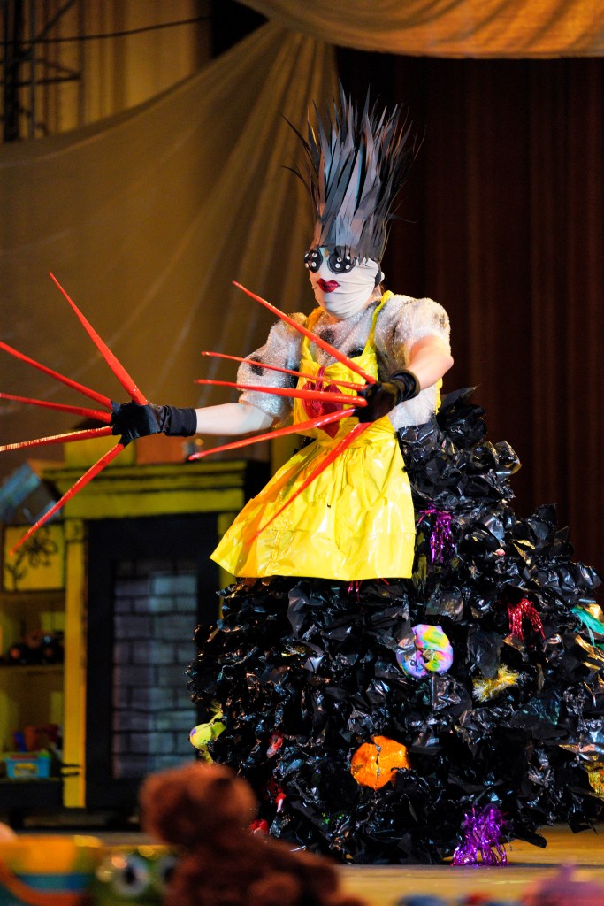 While Christine Crook’s costumes in the real world are distinctive and appropriate, they sizzle in the other world with bright colors and unusual textures. Combined with Ridenour’s set, the overall look of the other world is a kaleidoscopic phantasmagoria. Each character’s face is completely covered in gauzy material with comic-book facial features attached. As a result, the audience does not see the facial movement of the singing being produced. The outcome may seem a little disconcerting, but it absolutely adds to the menacing ambiance intended.