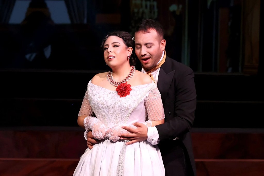 “La Traviata” opens with one of its two party scenes, and immediately, the audience is regaled with one of the opera’s myriad of highlights, the brindisi, or drinking song, ‘Libiamo ne’ lieti calici’ (‘Let’s drink from the joyful cups’). Alfredo must sing in full voice from the outset, and Alonso Sicarios-León, performing the part, brightens up to commence a solid rendition. He follows with the lead on the beautiful love duet ‘Un di felice, eterea’ (‘One day, happy and ethereal’) and demonstrates not only emotional power often associated with Italianate style, but a textured, rich voice with excellent control of dynamics. He exhibits many fine qualities that are well suited to tenor roles in the 19th century canon.