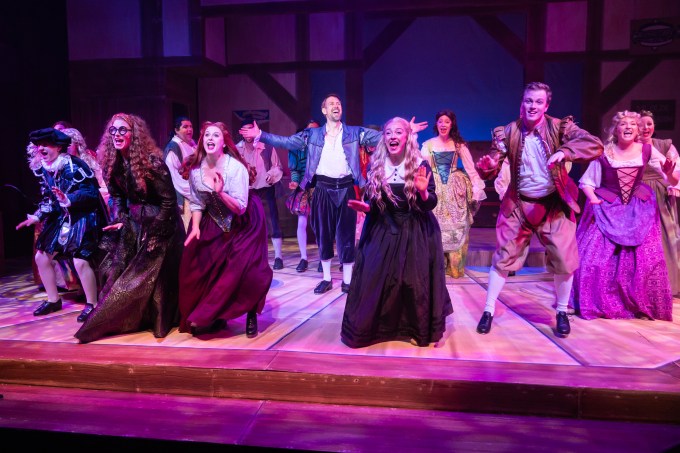 Shylock from “The Merchant of Venice” shows up so there can be a Jewish money lender, stage show producer, and source of schtick. Meanwhile, Puritan minister Brother Jeremiah tries to gum up the works with religious sanctimony. The final key character is the Renaissance rock star Shakespeare himself, played flamboyantly by a strutting, writhing, and shifty Julio Chavez. As you might infer, the lauded playwright and poet is depicted as a conniver and plagiarizer, but it’s all in good humor. Like all the leads in the cast, Chavez’s comic timing makes every laugh line work.