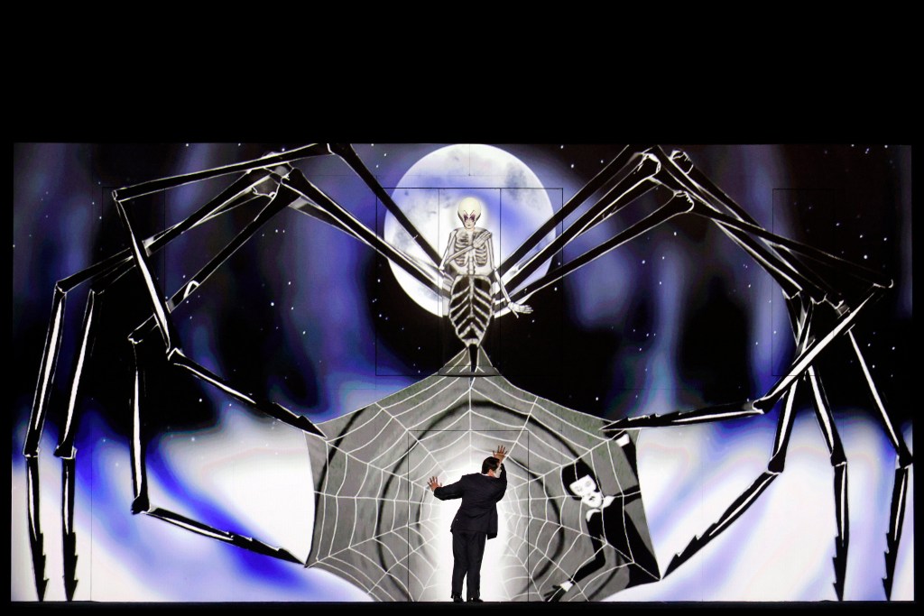 A phantasmagoria of animation festoons the screen throughout. While the still images in this review give an idea of some of the powerful look, they are a mere fraction of the dynamic eye candy on offer. Sight gags appear on and off the screen. The visuals are so enticing, constantly drawing the viewer’s eyes around the screen, competing with the supertitles, that a valid question is whether they actually distract the patron from the storyline or the music. A sampling of two operagoers says somewhat, but clearly, this is an individual thing.