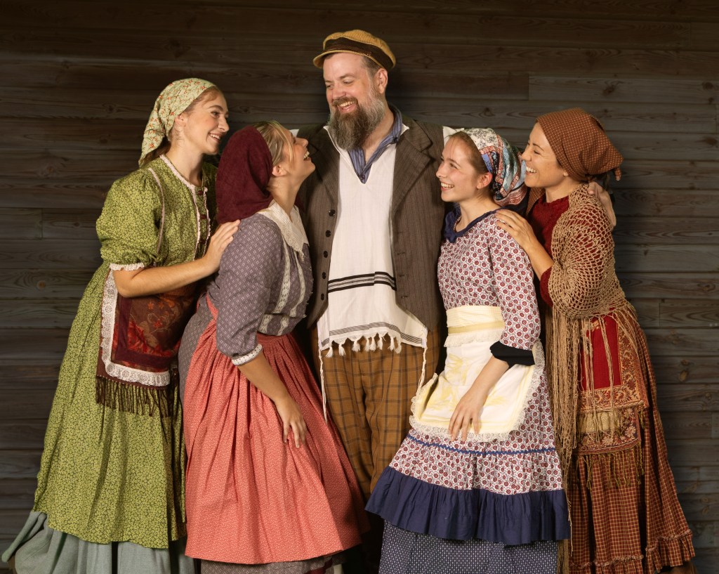 Hodel (Madelyn Davis-Haddad), Tzeitel (Gabrielle Goodman), Tevye (Joey McDaniel), Teagan Murphy (Chava), and Golde (Brittney Mignano). Photo by Scott Lasky.
