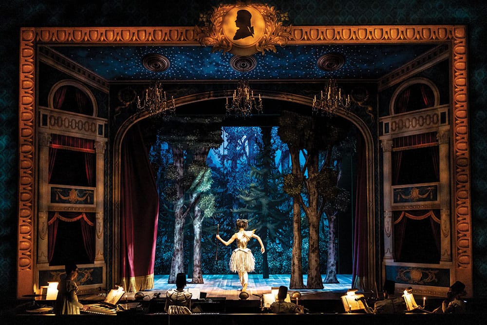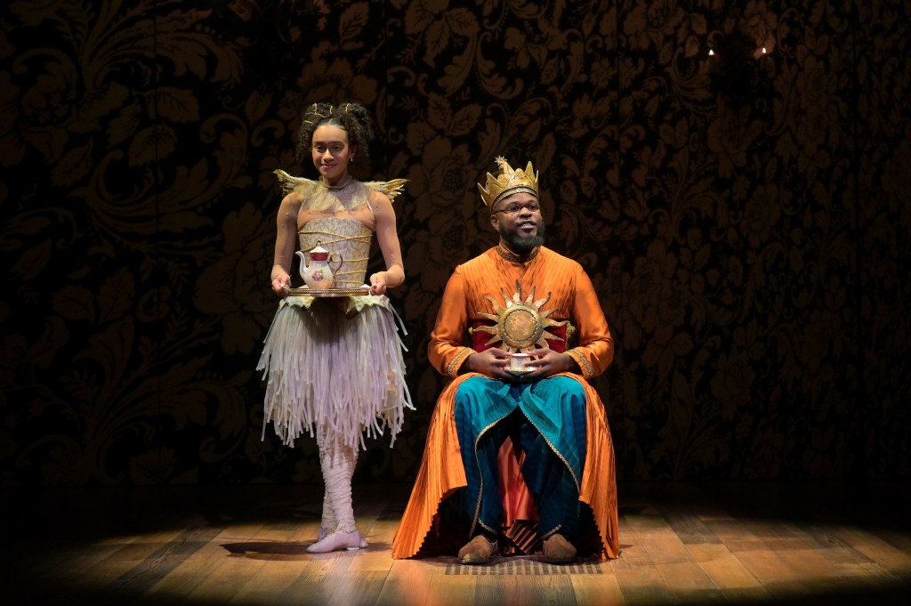 First impressions matter, and this production delivers. The descriptor “matchbox” becomes evident as Todd Rosenthal’s stage width for the proscenium arch is reduced by perhaps 40%, leaving a charming, intimate, colorfully-framed space that gives the look of a puppet-show stage, particularly when the larger performers are in the scene. Ana Kuzmanić’s fanciful costumery adds to the fairy tale look.