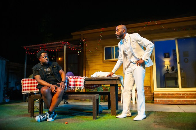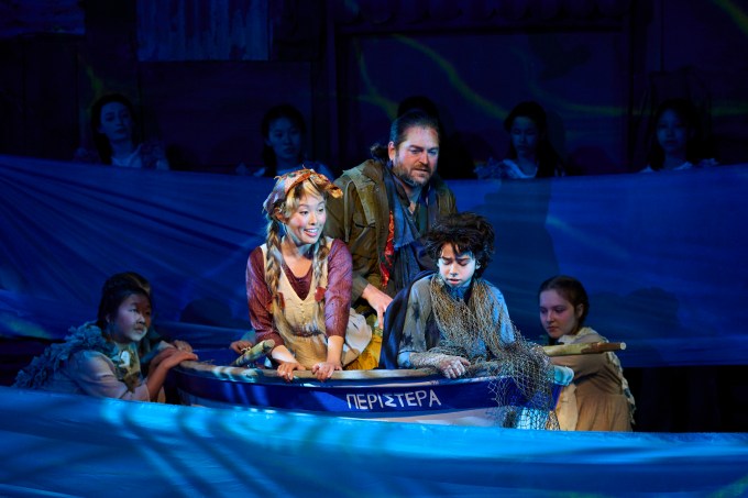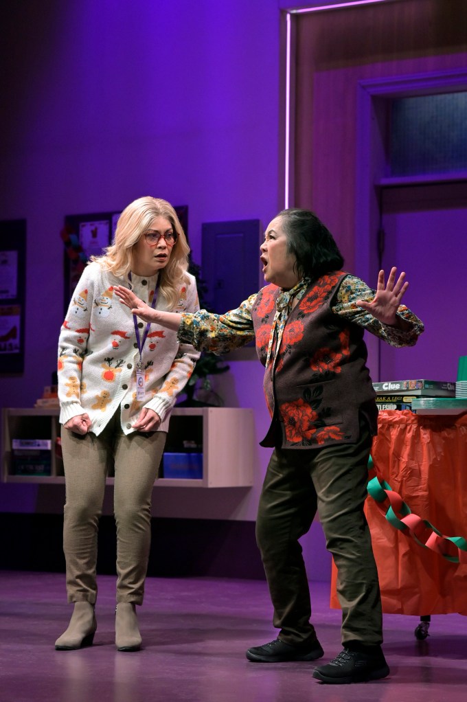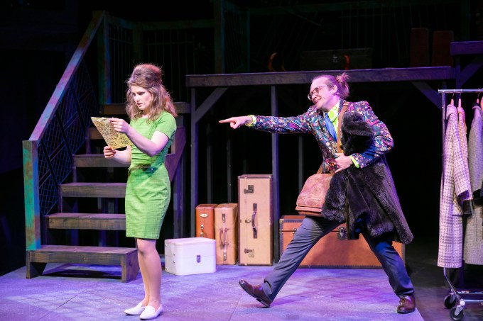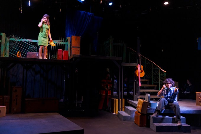 Boys and girls dance as a troupe in many numbers such as the lively and expectedly handsy “Born to Hand Jive” and the upbeat closing “We Go Together” with its array of nonsense syllables common especially to doowop. But also effective is when the cast is clustered in separate gender tribes as if in different locations and sing alternating verses. This technique is used in the reflective love ballad “Summer Nights” with Danny and Sandy leading their respective groups. It also works on “Those Magic Changes,” another love lament that cleverly starts as an instructional on guitar chord progressions for beginners! But the real litmus test is the peppy “You’re the One that I Want” which the cast passes with flying colors. We shouldn’t forget that there are also some solos that hit the spot, including the beautiful “Hopelessly Devoted to You,” which Kit Town caresses until she blasts off, and “Look at Me, I’m Sandra Dee” sung with appropriate derision by Seana Nicol as Rizzo.
