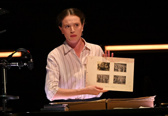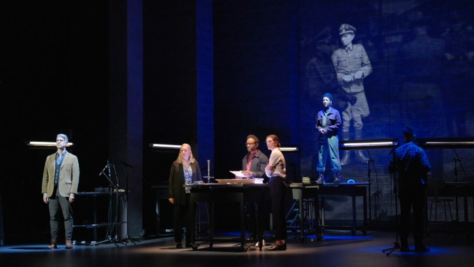 Indeed, this choreographed look into the lives of those who became cogs in the killing machine almost didn’t become known history. Why? The Holocaust Museum’s mission is to honor the victims of the Nazi horror, and perceived neutral or favorable depiction of the perpetrators could be used to glorify them. Only through the persistence of staff archivist Rebecca Erbelding, portrayed in the ensemble cast by Delia Cunningham, did the album see the light of day.