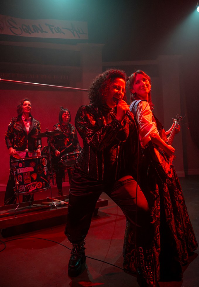 The play’s structure is somewhat eccentric in that the narrative is punctuated several times by musical performances from the four actors. It feels strange to experience them doing punk songs, with the ingénue-looking Anderson propelling a gritty-sounding guitar like a buzzsaw while others beat on percussion. The music is fun, but it’s hard to catch enough of the lyrics to know if they contribute to the story line. You might wonder why these interludes. Perhaps they make a symbolic link across the 400 years, supporting the notion that today is not so different from yesterday.