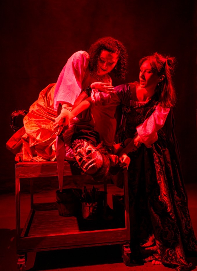 The action of the play is boisterous, replete with explicit language, simulated sex, and partial nudity, driven by a surprising and unusual script delivered by an all-female cast, perhaps in a nod to feminism. The performances by all four women are absolutely exemplary. My personal favorite is Maggie Mason displaying the confidence and pride of the devious Agostino who led Artemisia along after the rape, suggesting that they would marry. Keiko Shimosato Carreiro is also highly animated as Tuzia, a neighbor who became a surrogate mother to Artemisia, watching over her and providing essential support and information at the trial.
