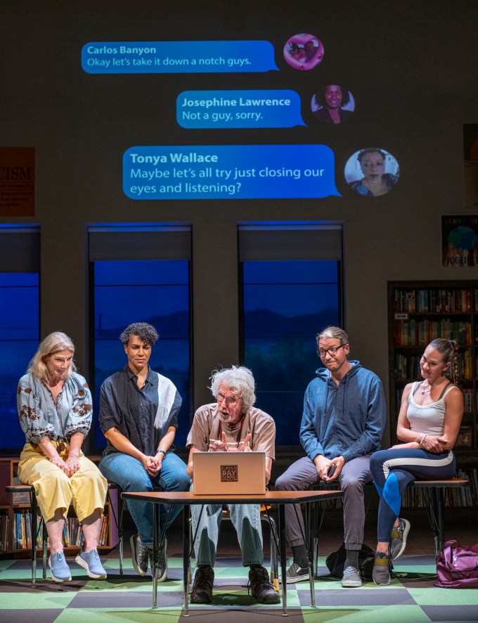The hilarity in the scenario comes when the board creates a “community activated conversation” to discuss the mumps options. The board meets in person but parents join in virtually, and the chat bubbles of the virtual attendees scroll on projections. They come so fast and are so screamingly funny that it is challenging to also pay attention to what the live performers are saying. It is an unimaginably well-designed and executed sequence with one big laugh after another for several minutes.