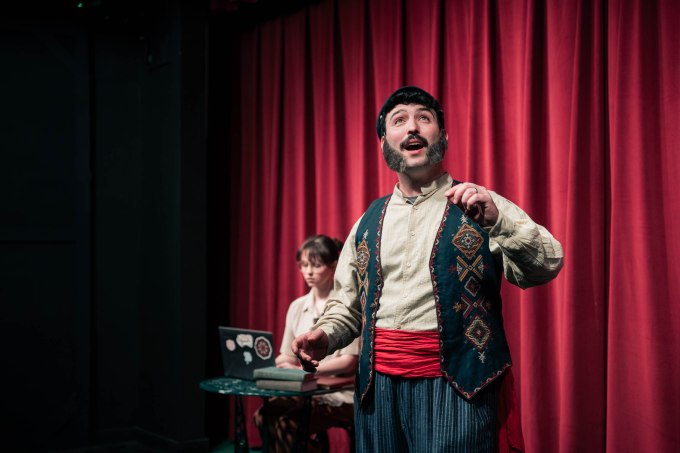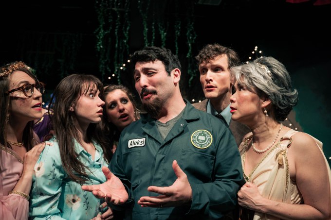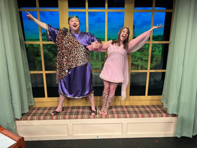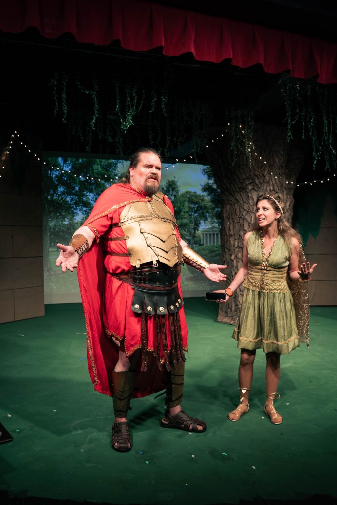 From the outset, Anna Wesner’s Daphne is a timid and bookish soul, but she animates with hysteria, determination, and amor as the plot thickens. Her relationship with Ralph, a sometimes stuttering and daft Paul Bisesi, is conflicted by their respective professional standing and by their attraction. It becomes more conflicted when Daphne, made invisible by the Gods, hears Ralph refer to her as his assistant. The shoe is on the other foot when she thinks she is still invisible and admits in front of Ralph that she lost the irreplaceable book.